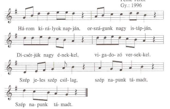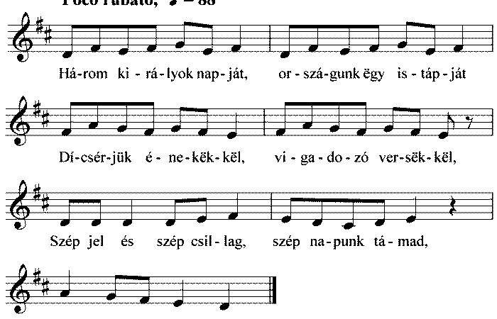 Három királyok napján, országunk nagy istápján,Dicsérjük nagy énekkel, vigadozó versekkel.Szép jeles szép csillag, szép napunk támadt,Szép napunk támadt.