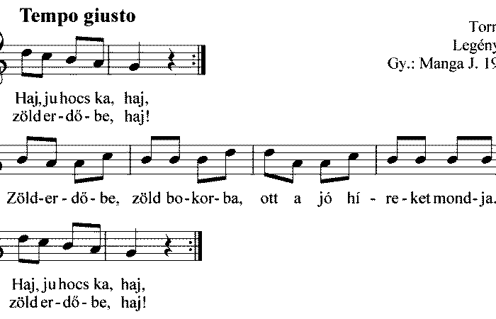 Haj, juhocska, haj, zöld erdőbe, haj! Zöld erdőbe, zöld bokorba, ott a jó híreket mondja. Haj, juhocska, haj! zöld erdőbe,...