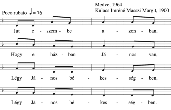 Jut eszembe azonban, Hogy e házban János van, Légy János békességben, Légy János békességben. Jöttünk hozzád jó este, Köszöntünk egészségbe,...
