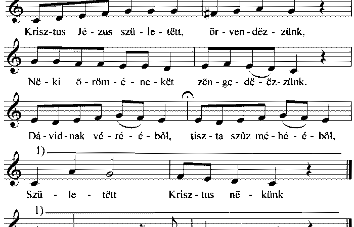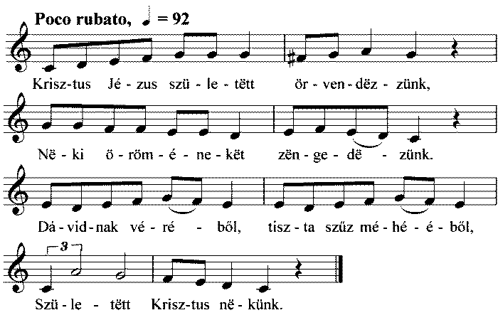 1. Krisztus Jézus születëtt örvendëzzünk, Nëki öröménekët zëngedëzünk. Dávidnak véréből, tiszta szűz méhéből, Születëtt Krisztus nëkünk. 2. A szüzësség lilioma...