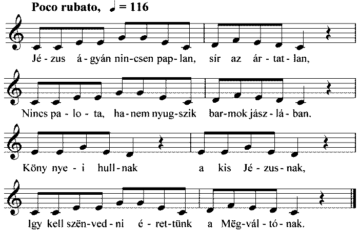 1. Jézus ágyán nincsen paplan, sír az ártatlan, Nincs palota, hanem nyugszik barmok jászlában. Könnyei hullnak a kis Jézusnak, Igy...