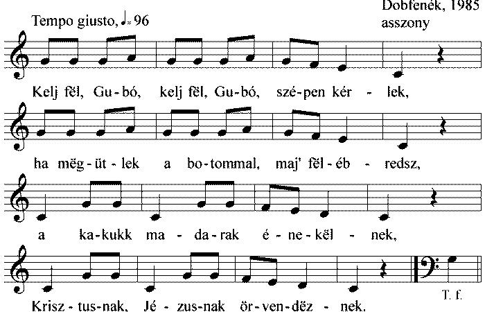 Kelj fel, Gubó, kelj fël, Gubó, szépen kérlek, Ha mëgütlek a botommal, maj’ fëlébredsz, A kakukk madarak énekëlnek, Krisztusnak, Jézusnak...