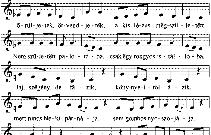 Karácsonynak éjszakáján, Krisztus születésë napján, Örüljetek, örvendjetëk, a kis Jézus mëgszületëtt. Nem születëtt palotába, csak ëgy rongyos istállóba. Jaj, szëgény,...