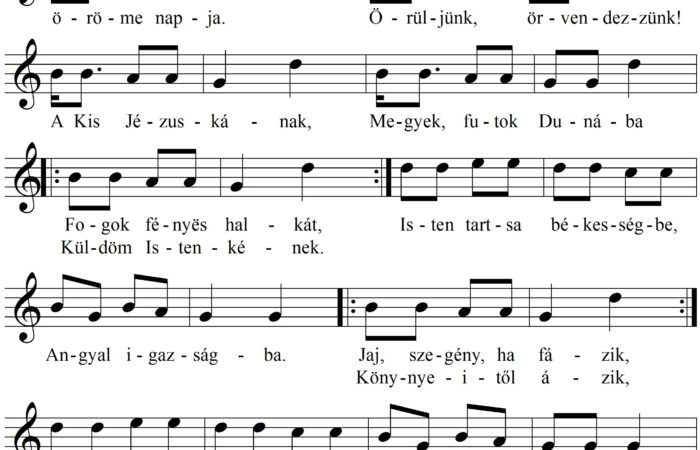 Karácsony van ma, ünnepëk napja, Krisztus Urunk születése, öröme napja. Örüljünk, örvendezzünk a kis Jézuskának! Megyek, futok Dunába, Fogok fényës halkát,...