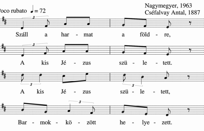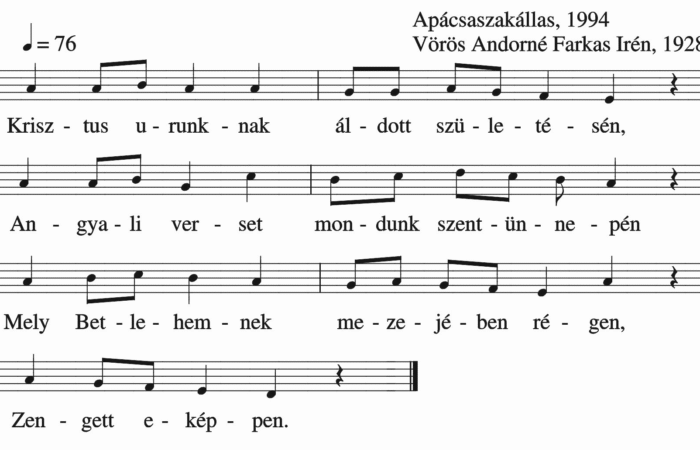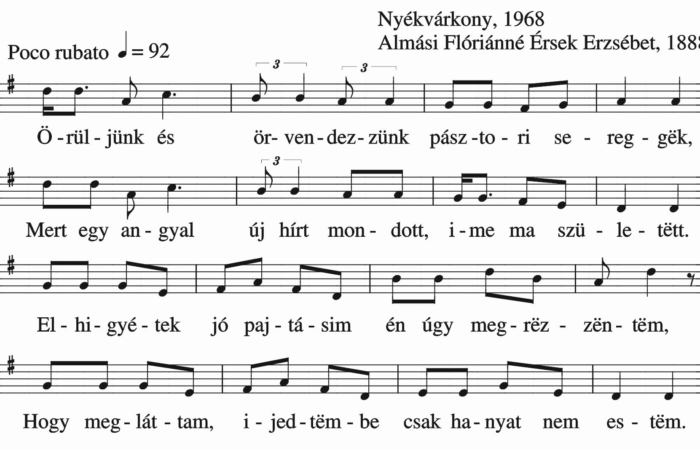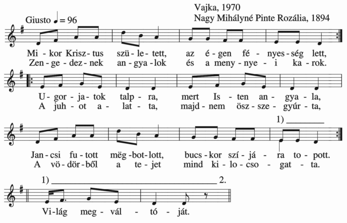 Mëgszületett nëkünk kisdëd Jézus, Az hideg ászojba, rongyos istállóba. Barmok, ëkrëk, rája lehelészve, És örvendezvívë,  így ërvëndëzvé. Hát ti szegény...