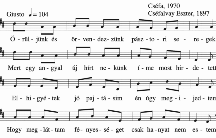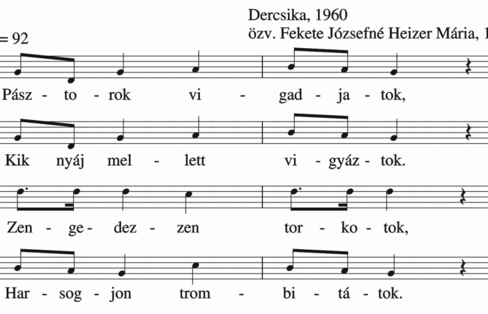 Pásztorok vigadjatok, Kik nyáj mellett vigyáztok. Zengedezzen torkotok, Hsrsogjon trombitátok. Én az éjjel álmomba’, Angyal szavát hallottam. Világosságot láttam, Mindjárt...