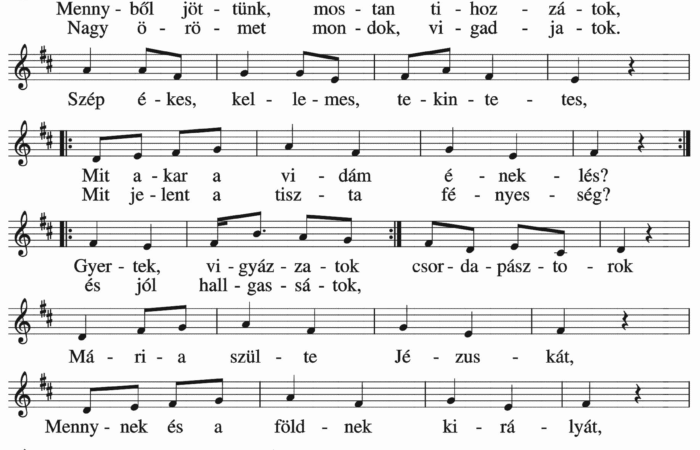 Mennyből jöttünk mostan tihozzátok, Nagy örömet mondok, vigadjatok. Szép, ékes, kellemes, tekintetes, Mit akart a vidám éneklés? Mit jelent a...