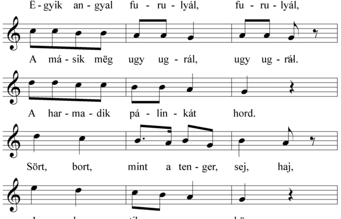 Míg az embër álmodoz, álmodoz, Három angyal fáradoz, fáradoz. Ëgyik angyal furulyál, furulyál, A másik mëg ugy ugrál, ugy ugrál. A harmadik...