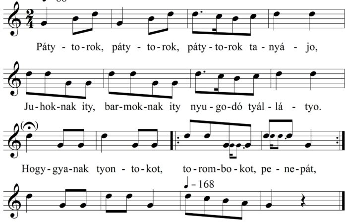 1. Pátytorok, pátytorok, pátytorok tanyájo, Juhoknak ity, barmoknak ity nyugodó tállátyo. Hoggyanak tyontokot, torommbokot, penepát, Hoggyanak kalátykát, én itsz itt...