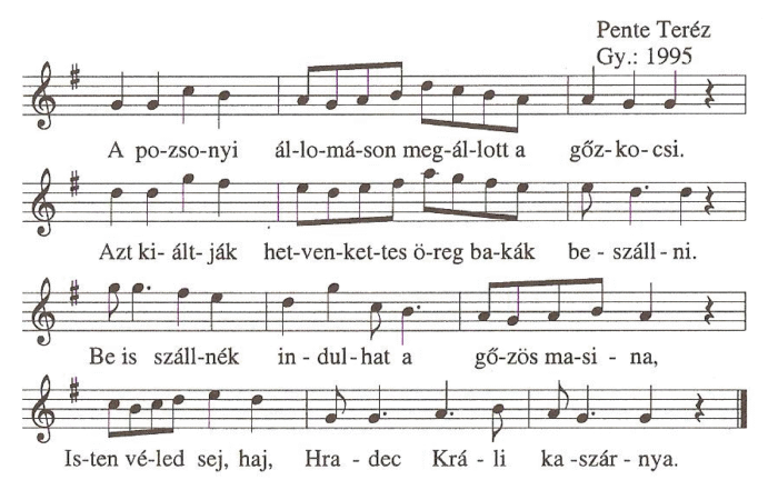 A pozsonyi állomáson megállott a gőzkocsi.Azt kiáltják hetvenkettes öreg bakák beszállni.Be is szállnék indulhat a gőzmasina,Isten véled sej, haj, Hradec...