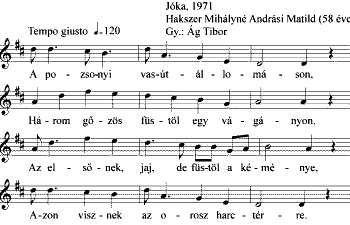 1. A pozsonyi vasút állomáson,Három gőzös füstöl egy vágányon.Az elsőnek, jaj, de füstöl a kéménye,Azon visznek az orosz harctérre.2. Az...