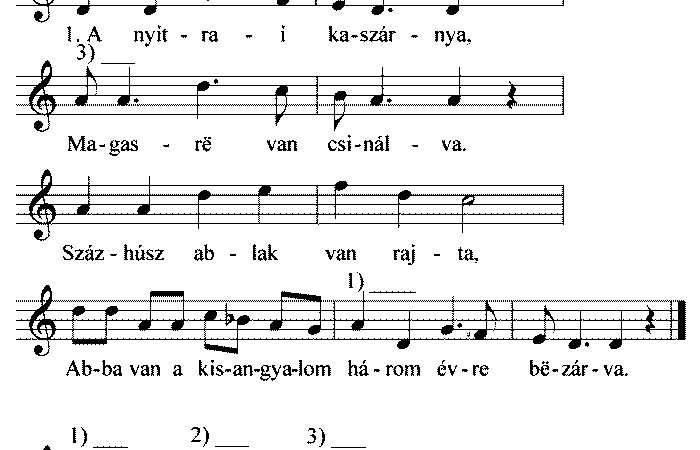 1. A nyitrai kaszárnya, Magasre van csinálva, Százhúsz ablak van rajta, Abban van a kisangyalom három évre bezárva. 2. A...