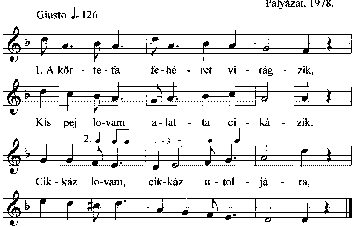 1. A körtefa fehéret virágzik, Kis pej lovam alatta cikkázik, Cikkáz lovam, cikáz utoljára, Rajtad megyëk nagy Németországba. 2. Emlékezzél...