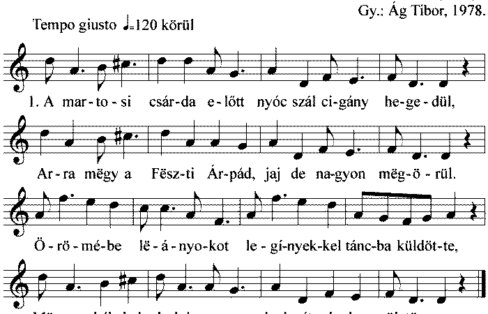 1. A martosi csárda előtt nyóc szál cigány hegedül, Arra mëgy a Fëszti Árpád, jaj, de nagyon mëgörül. Örömébe lëányokot...