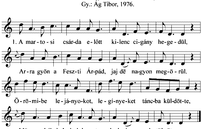 1. A martosi csárda előtt kilenc cigány hegedül, Arra gyön a Feszti Árpád, jaj, dë nagyon megörül. Örömibe lejányokat, legínyeket...