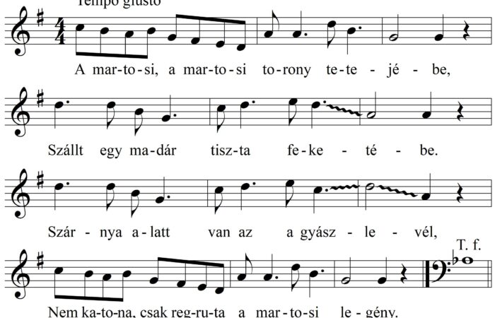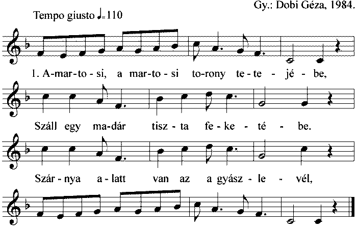 1. A martosi, a martosi torony tetejébe, Szállt egy madár tiszta feketébe. Szárnya alatt van az a gyászlevél, Nem katona,...