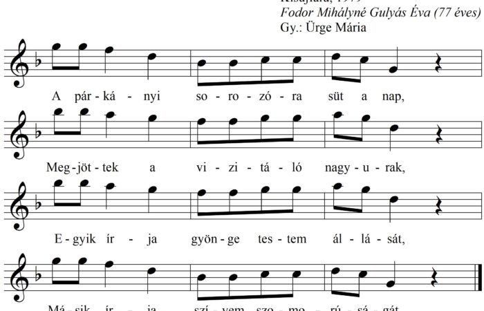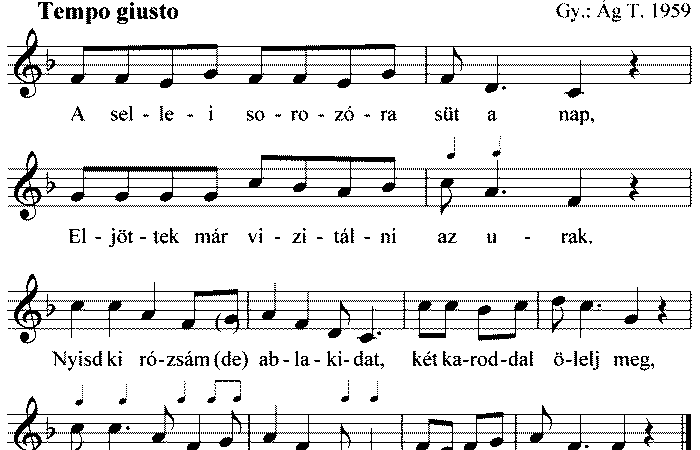 1. A sellei sorozóra süt a nap, Eljöttek már vizitálni az urak. Nyisd ki rózsám (de) ablakidat, két karoddal ölelj...