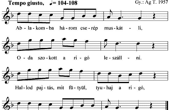 1. Ablakomba három cserép muskátli, Oda szokott a rigó leszállni. Hallod pajtás, mit fütyül, tyuhaj a rigó, Katonának iratott be...