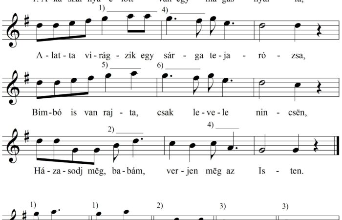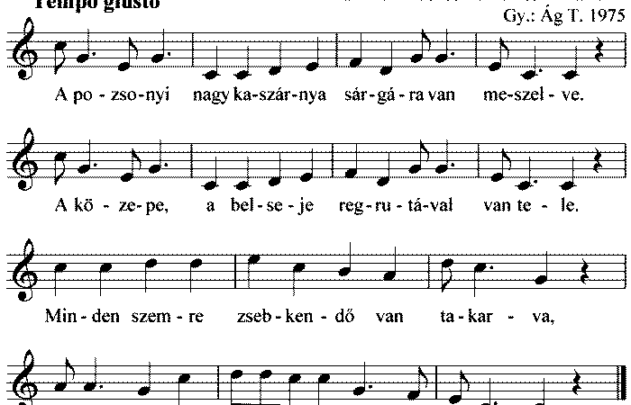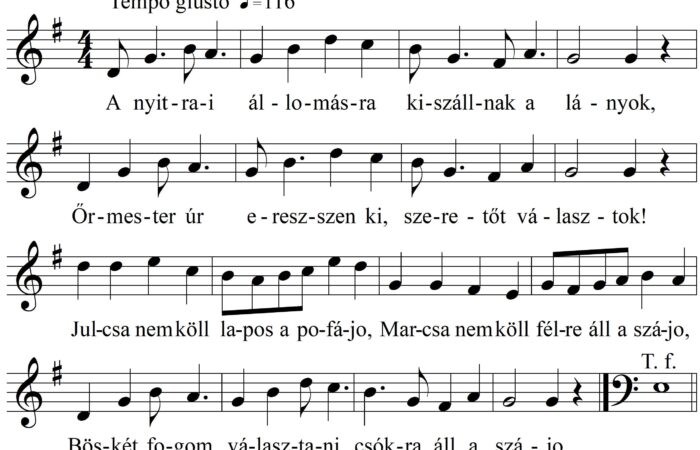 1. A csucsomi magas tetőn Szénát kaszál a szeretőm, Szénát, szénát, nem gabonát, Szőkét szeretek, nem barnát. 2. Édes volt...
