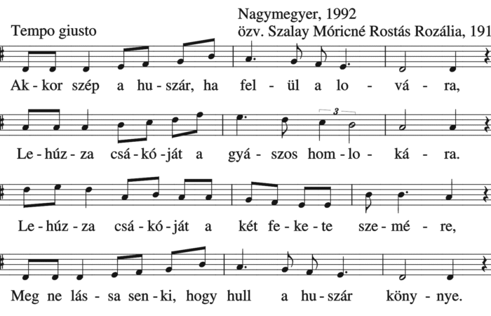 Akkor szép a huszár, ha felül a lovára, Lehúzza csákóját a gyászos homlokára. Lehúzza csákóját a két fekete szemére, Meg...