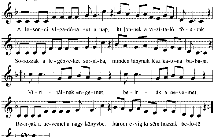 A losonci vigadóra süt a nap, Itt jönnek a vizitáló főurak, Sorozzák a legényeket sorjába, Mindën lánynak lësz katona babája,...