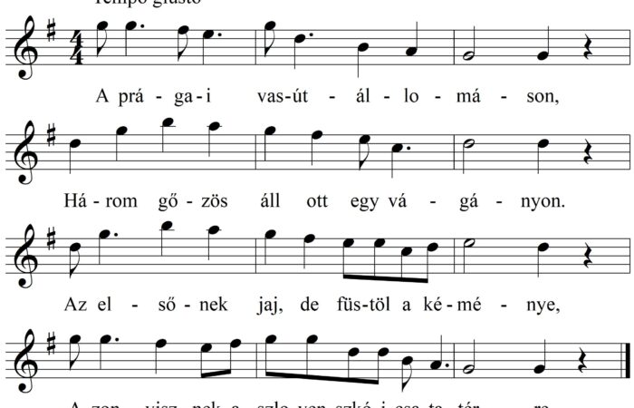 1. A prágai vasútállomáson, Három gőzös áll ott a vágányon. Az elsőnek jaj, de füstöl a kéménye, Azon visznek a...