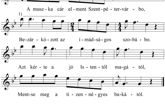 1. A muszka cár elment Szentpétervárbo, Bezárkózott az imádságos szobábo. Azt kérte a jó Istentől magától, Mentse meg a tizennégyes...