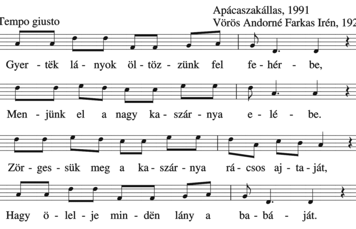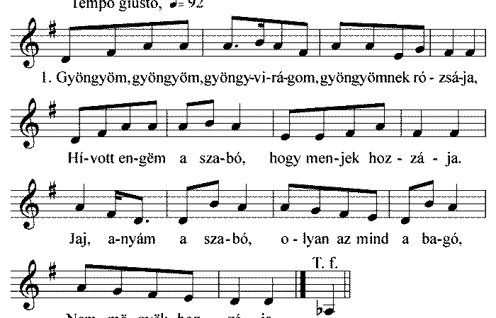 1. Gyöngyöm, gyöngyöm, gyöngyvirágom, gyöngyömnek rózsája, Hívott engem a szabó hogy menjek hozzája, Jaj, anyám a szabó, olyan az mind...
