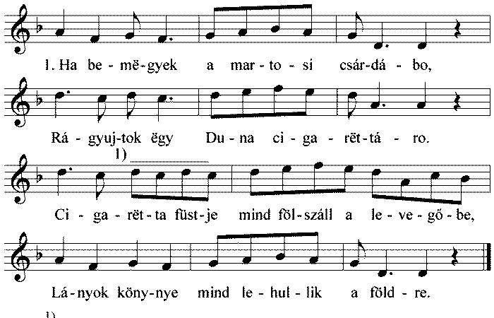 1. Ha bemëgyek a martosi csárdábo, Rágyujtok ëgy Duna cigarëttáro, Cigarëtta füstje mind fölszáll a levegőbe, Lányok könnye mind lehullik...