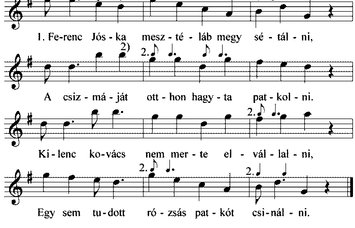 1. Ferenc Jóska mesztéláb megy sétálni, A csizmáját otthon hagyta patkolni, Kilenc kovács nem merte elvállalni, Egy sem tudott rózsás...
