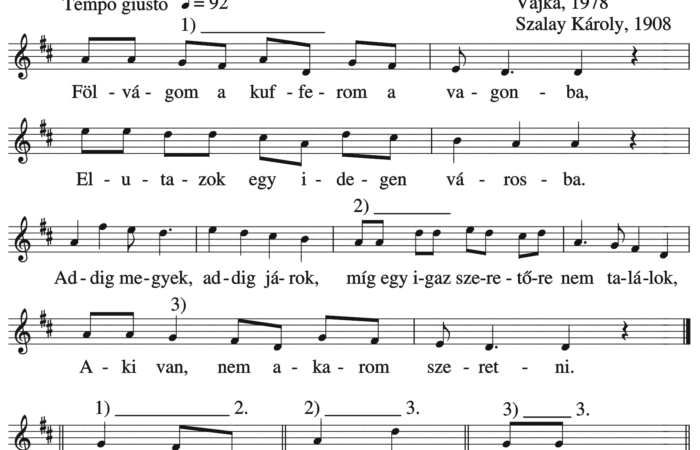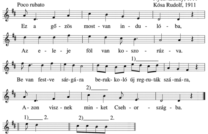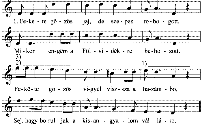 1. Fekete gőzös, jaj, de szépen robogott, Mikor engëm a Fölvidékre behozott, Fekëte gőzös vigyél vissza a hazámbo, Sej, hagy...
