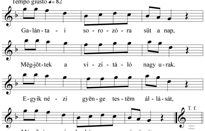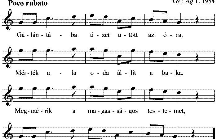 1. Galántába tizet ütött az óra, Mérték alá odaállít a baka. Megmérik a magasságos testëmet, Hej, te fiú, fordulj előre...