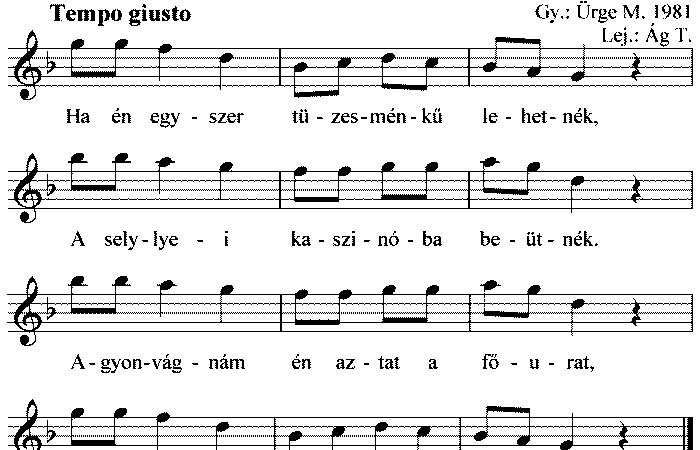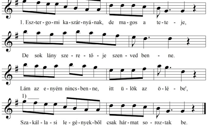 1. Esztergomi kaszárnyának, de magos a teteje, De sok lány szeretője szenved benne. Lám az enyém nincs benne, itt ülök...