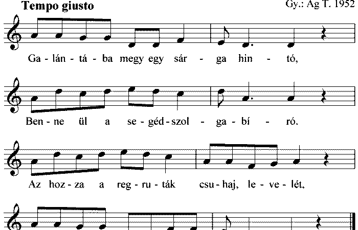 1. Galántába megy egy sárga hintó, Benne ül a segédszolgabíró. Az hozza a regruták csuhaj, levelét, Sok kislánynak szomorítja a...