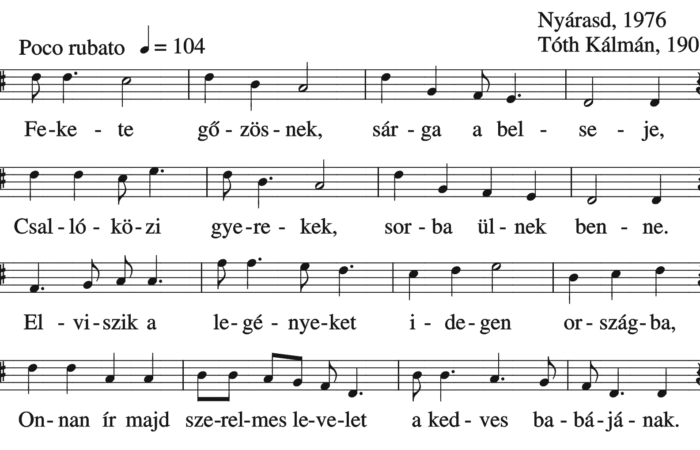 Fekete gőzösnek sárga a belseje, Csallóközi gyerekek sorba ülnek benne. Elviszik a legényeket idegen országba, Onnan ír majd szerelmes levelet...