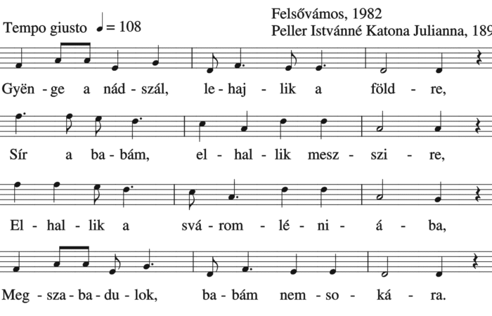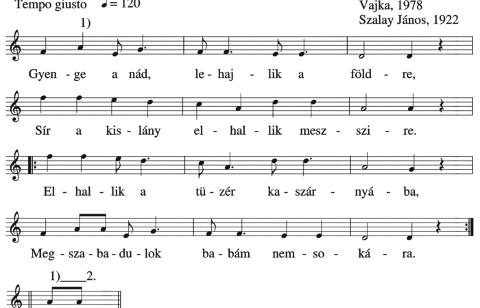 Gyënge a nádszál, lehajlik a földre, Sír a babám, elhallik messzire, Elhallik a sváromléniába, Megszabadulok, babám, nemsokára. Megszabadulok, meg is...