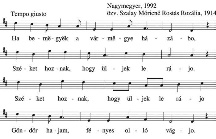 Ha bemëgyëk a vármëgye házábo, Széket hoznak, hogy üljek le rájo. Széket hoznak, hogy üljek le rájo, Göndör hajam fényes...