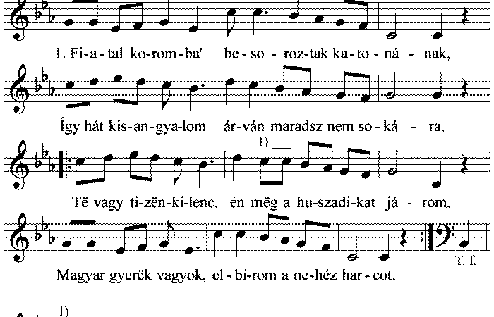 1. Fiatal koromba besoroztak katonának, Így hát kisangyalom árván maradsz nemsokára, Të vagy tizënkilenc, én mëg a huszadikat járom, Magyar...
