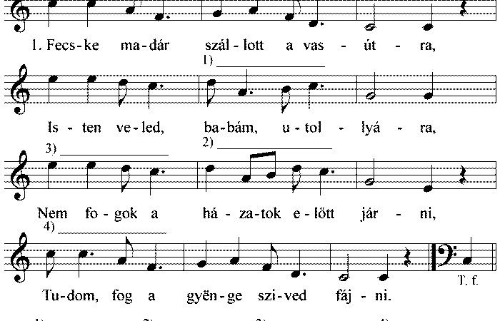 1. Fecskemadár szállott a vasútra, Isten veled babám, utoljára, Nem fogok  a házatok előtt járni, Tudom, fog a gyënge szived...
