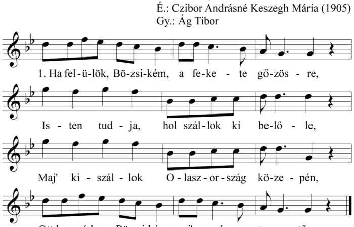 1. Ha felülök, Bözsikém, a fekete gőzösre, Isten tudja, hol szállok ki belőle, Maj‘ kiszállok Olaszország közepén, Ott lesz nékem,...