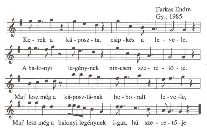 1. Kerek a káposzta , csipkés a levele,A balonyi legénynek nincsen szeretője.Maj' lesz még a káposztának beborult levele,Maj' lesz még...