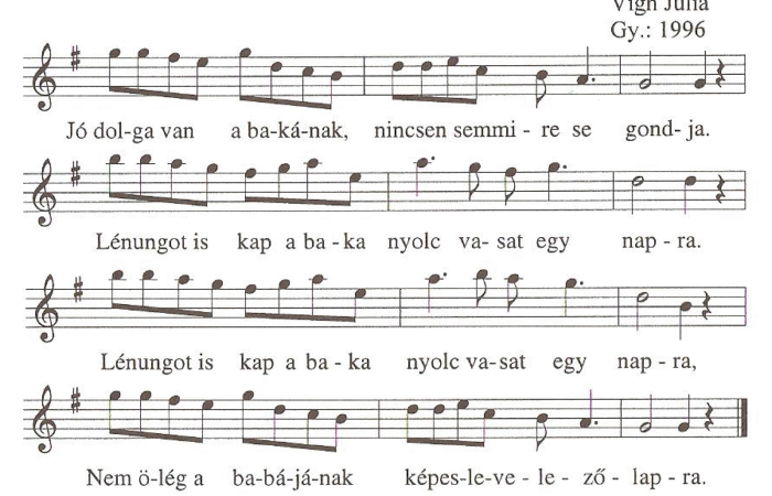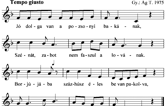1. Jó dolga van a pozsonyi bakának, Szénát, zabot nem faszul a lovának. Borjújába százhúsz éles be van pakolva, Kisangyalom...