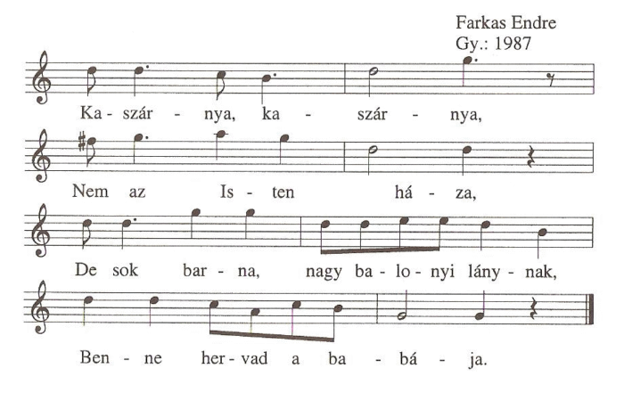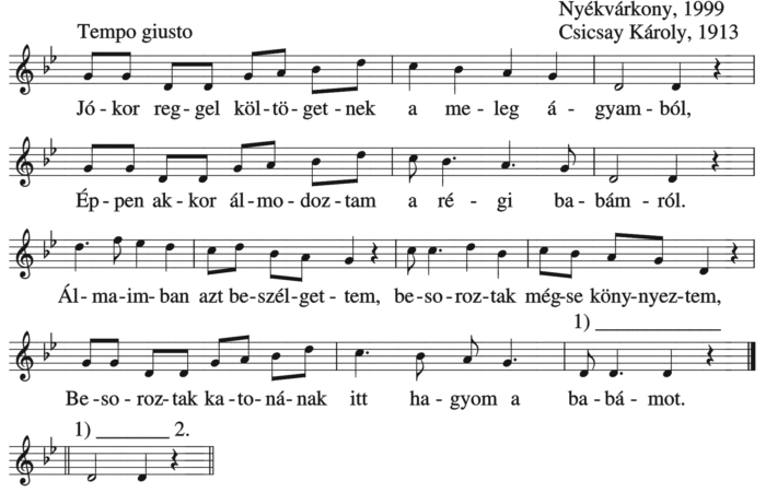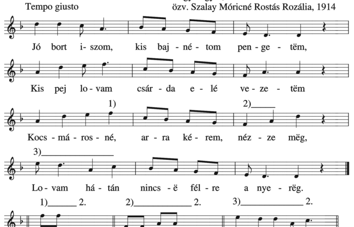 Jó bort iszom, kis bajnétom pengetëm, Kis pej lovam csárda elé vezetëm. Kocsmárosné, arra kérem, nézze mëg, Lovam hátán nincs-ë...