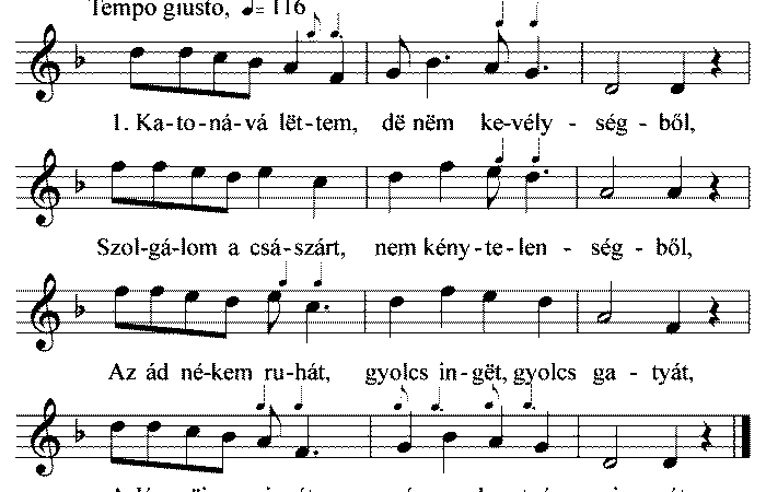 1. Katonává lettem, de nem kevélységből, Szolgálom a császárt, nem kénytelenségből, Az ád nékem ruhát, gyolcs inget, gyolcs gatyát, Alám...