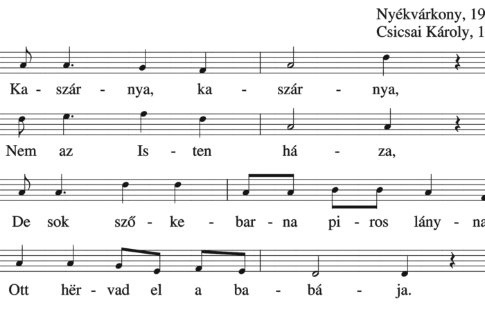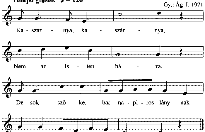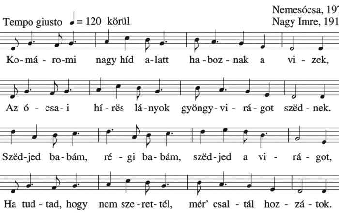 Komáromi nagy híd alatt haboznak a vizek, Az ócsai hírës lányok gyöngyvirágot szëdnek. Szëdjed babám, régi babám, szëdjed a virágot....