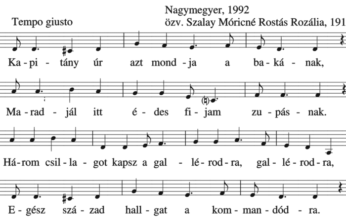 Kapitány úr azt mondja a bakának, Maradjál itt édes fijam zupásnak. Három csillagot kapsz a gallérodra, gallérodra. Egész század hallgat...