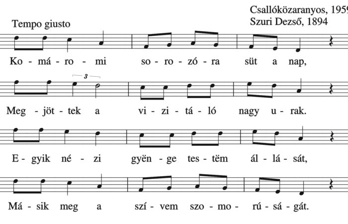 Komáromi sorozóra süt a nap, Megjöttek a vizitáló nagyurak. Egyik nézi gyënge testëm állását, Másik meg a szívem szomorúságát. Komáromi...