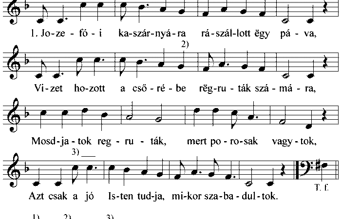 1. Jozefói kaszárnyára rászállott egy páva, Vizet hozott a csőrébe rëgruták számára, Mosdjatok regruták, mert porosak vagytok, Azt csak jó...