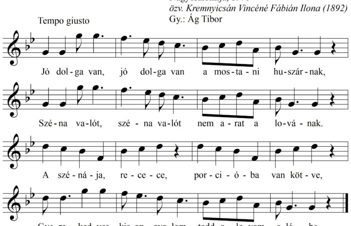 Jó dolga van, jó dolga van a mostani huszárnak, Széna valót, széna valót nem arat a lovának. A szénája, recece, porcióba van kötve,...