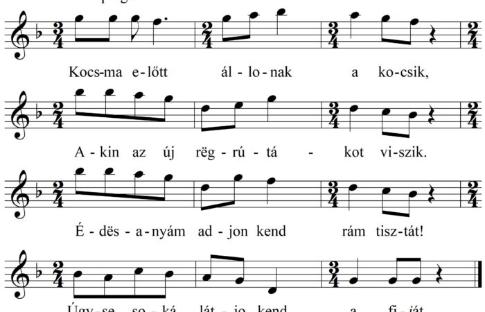 1. Kocsma előtt állonak a kocsik, Akin az új rëgrútákot viszik. Édësanyám adjon kend rám tisztát! Úgyse soká látjo kend...